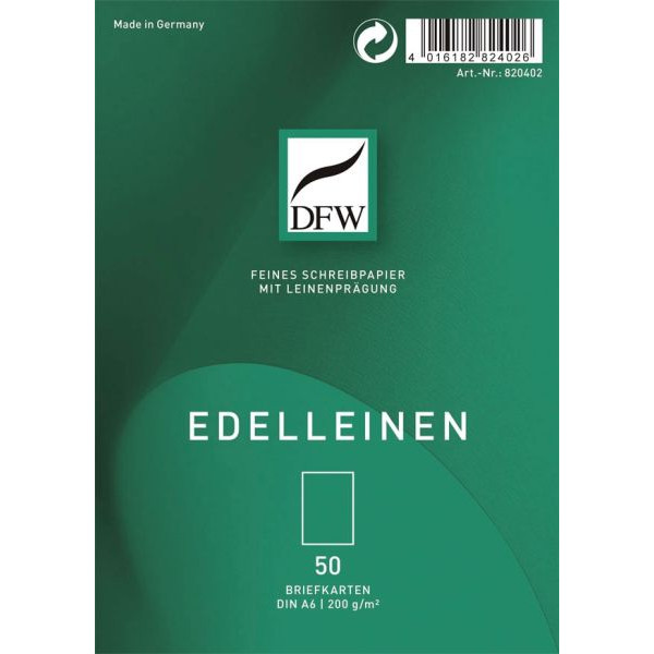 "Briefkarte A6 Edelleinen 50ST";"DFW Edelleinen - industriell gefertigtes Papier mit Leinenstruktur. Die Schreibpapier-Serie mit dezenter Leinenprägung für die anspruchsvolle Privatkorrespondenz vermittelt schlichte Eleganz und präsentiert einmal mehr die vielfältigen Möglichkeiten der Papiergestaltung. Edelleinen ist neben Meisterbütten eine exclusive Komponente der Standard-Schreibpapiere."