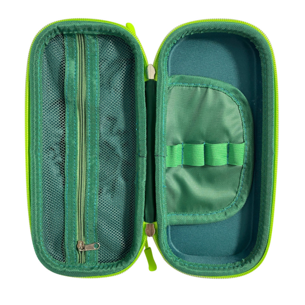 Das Schlamperpennal „T-Rex“ ist ein praktisches und gleichzeitig cooles Schreibwaren-Accessoire für Kinder. Mit den Maßen 23,3 × 10 × 4,3 cm bietet es viel Platz für Stifte und Zubehör. Das 3D-Motiv sorgt für einen besonderen Hingucker. Ausgestattet mit einem Reißverschluss, einer Innenklappe mit Stifteschlaufen und einem Netzfach, bleiben alle Utensilien ordentlich verstaut. Gefertigt aus EVA und Polyester, ist das Pennal robust und langlebig.