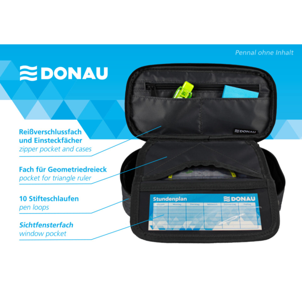 | mit Reißverschlussfach und zwei Einsteckfächern, Innenklappe mit Fach für Geometriedreieck, Sichtfenster für Stundenplan, 10 Stifteschlaufen | |