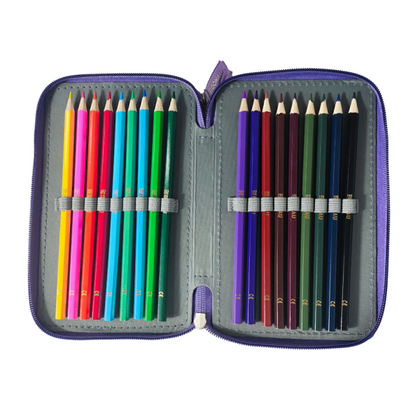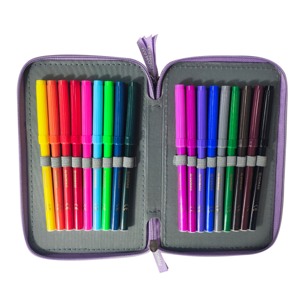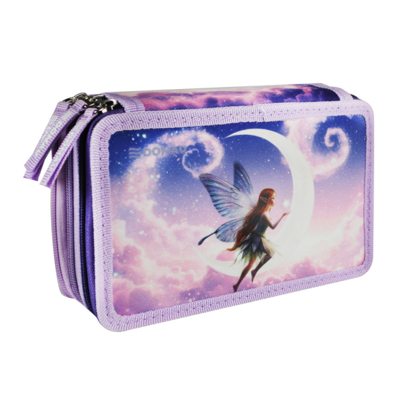 Schuletui „Fee“ mit drei Fächern, komplett gefüllt und mit eingenähter kleiner Tasche. Das 43-teilige Set enthält 1 Radierer, 1 Spitzer, 3 Bleistifte, 1 Lineal, 1 Stundenplan, 18 Fasermaler und 18 Farbstifte. Gefertigt aus strapazierfähigem Polyester, Größe ca. 200 x 60 x 130 mm. Ideal für Schule und Freizeit – alles ordentlich an einem Platz.