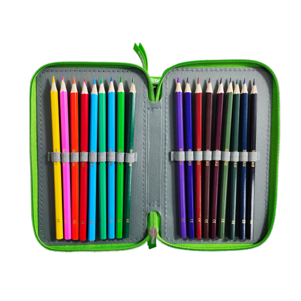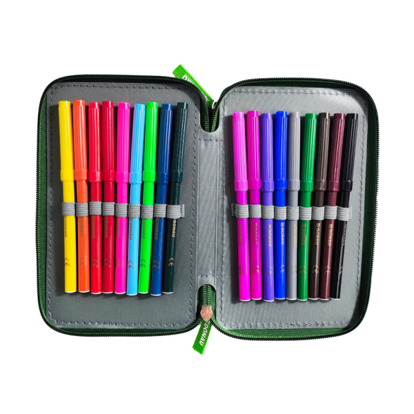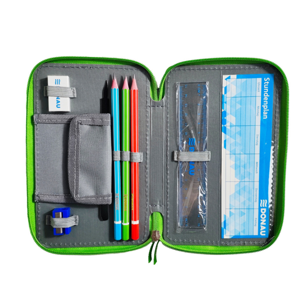 Schuletui „T-Rex“ mit drei Fächern, komplett gefüllt und mit eingenähter kleiner Tasche. Das 43-teilige Set enthält 1 Radierer, 1 Spitzer, 3 Bleistifte, 1 Lineal, 1 Stundenplan, 18 Fasermaler und 18 Farbstifte. Hergestellt aus strapazierfähigem Polyester, Größe ca. 200 x 60 x 130 mm. Ideal für Schule und Freizeit – mit spannendem T-Rex-Design.