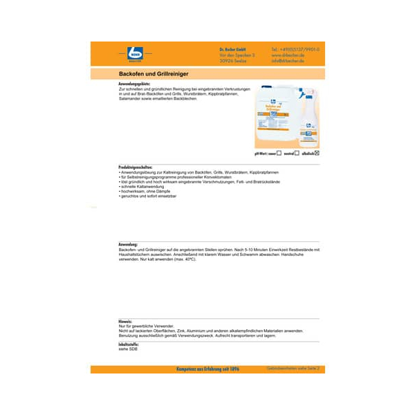 Wenn Sie auf der Suche nach einem zuverlässigen Reinigungsmittel für Ihren Backofen oder Grill sind, dann ist der DR.BECHER 1752000 die richtige Wahl. Mit seiner leistungsstarken Formel und einfachen Anwendung sorgt er für eine gründliche und effektive Reinigung. Kaufen Sie jetzt den DR.BECHER 1752000 und erleben Sie selbst die beeindruckenden Ergebnisse! zum Datenblatt