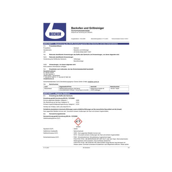 Gemäß der GHS-Kennzeichnung hat der DR.BECHER 1752000 die Gefahrenkennzeichnung GHS05 und das entsprechende Signalwort "GEFAHR". Das bedeutet, dass bei der Verwendung Vorsicht geboten ist.