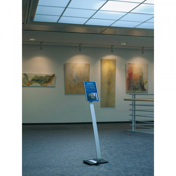 Der Aufsteller erfüllt seinen Zweck, durch die hoch- oder quer-Anordnung der eigentlichen Infotafel gut einsetzbar. Das Design ist allerdings wenig durchdacht. Der klobige schwarze Fuß und die asymetrisch angeordnete Stele lassen das gesamte Ensemble eher krumm und schief (vor allem in der hoch-Einstellung der Tafel) wirken als "designed". Vorschlag: Stele mittig aufsetzen und Fuß in Alu-Optik pulverbeschichten.