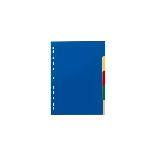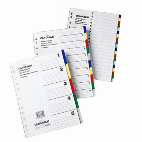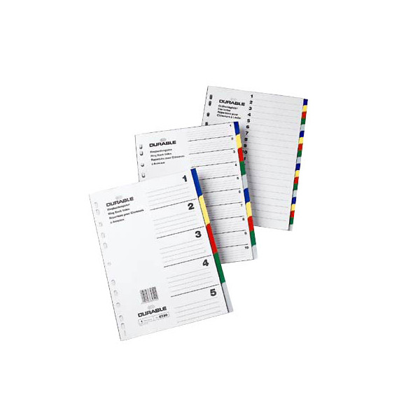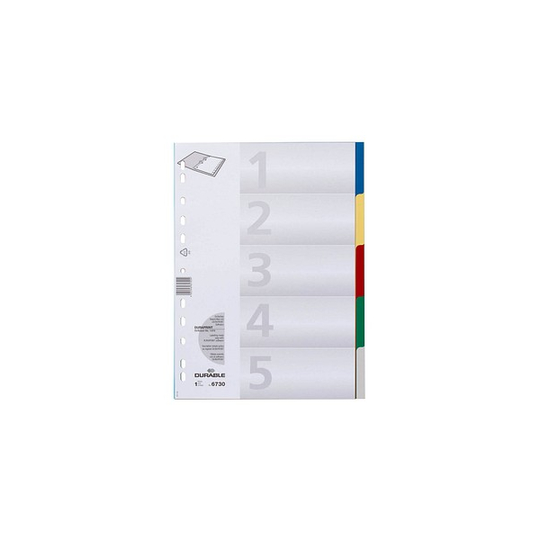 Durable 673027 Blankoregister in A4. • Tabenfarbe: farbige Taben • Folienstärke: 120my • Registerteilung: 5-teilig blanko • Lochung: Universallochung • Tabs nicht wechselbar