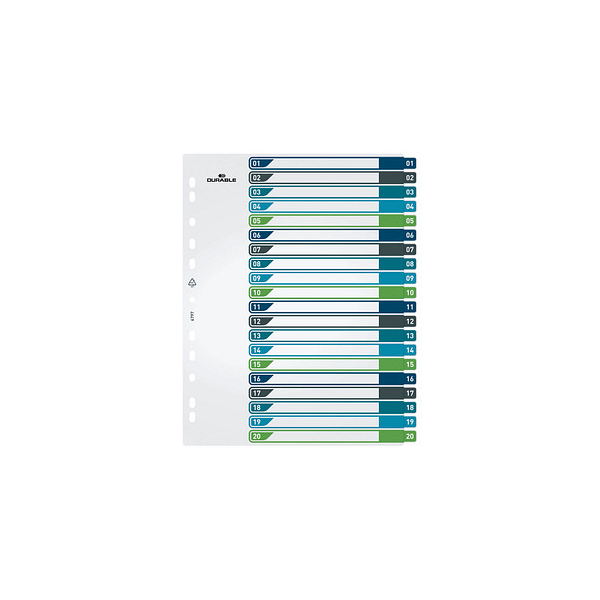 Entdecken Sie das hochwertige Kunststoffregister 679727 von Durable, das Ihnen eine übersichtliche und geordnete Ablage Ihrer Dokumente ermöglicht. Mit 20 farbigen Registertaben, die von 1 bis 20 nummeriert sind, können Sie Ihre Unterlagen im Format A4+ optimal sortieren und schnell finden.