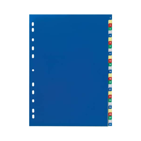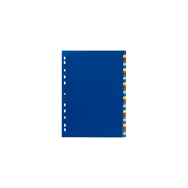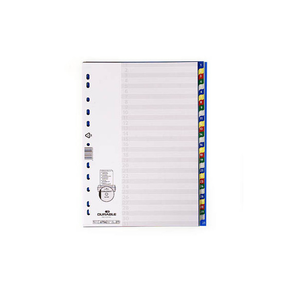 Durable mit farbigen Taben 6756.27 Zahlenregister in A4. • Tabenfarbe: farbige Taben • Folienstärke: 120µm • Registerteilung: 1 bis 31 • Lochung: Universallochung • Tabs nicht wechselbar