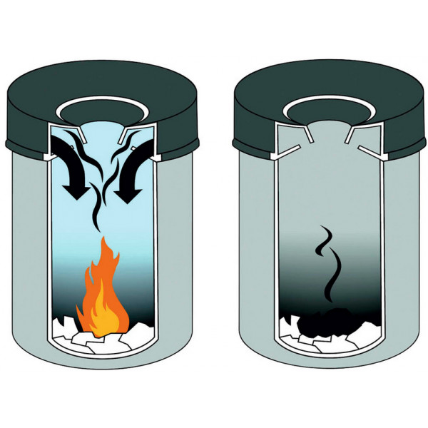 der selbstlöschende Deckel unterbricht die Sauerstoffzufuhr im Papierkorb und erstickt die Flammen rechtzeitig