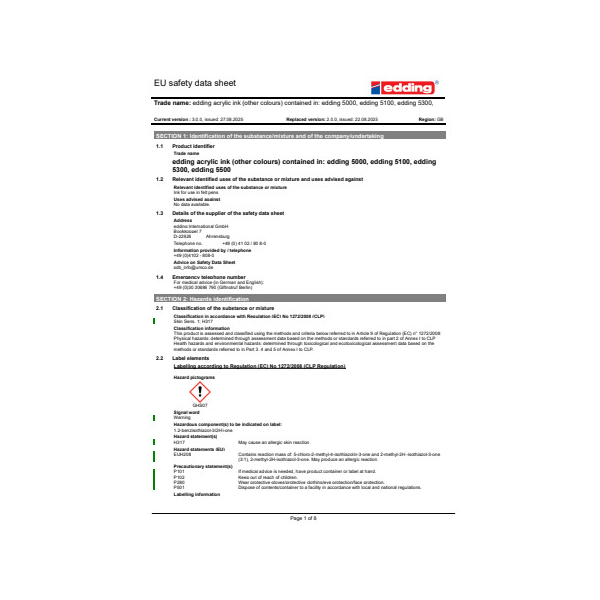 edding International GmbH, Bookkoppel 7 D-22926 Ahrensburg, Telefon-Nr. +49 (0) 41 02 / 80 8-0, sdb_info@umco.de