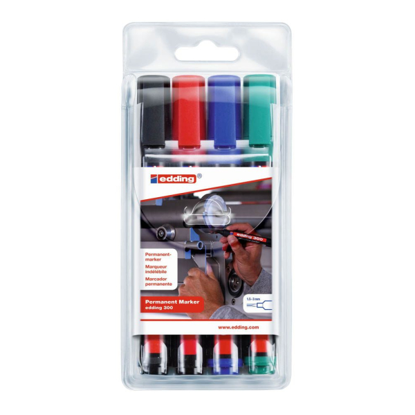 Edding Permanentmarker 300, 4-300-4-2, Packung, 4-farbig sortiert, 1,5-3mm Rundspitze