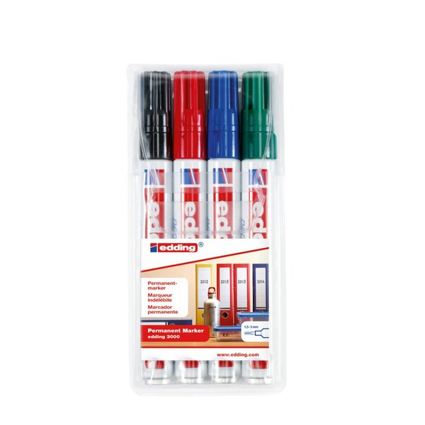Edding 3000 4-3000-4-2 Permanentmarker nachfüllbar. • Schreibfarbe: 4-farbig sortiert / farbig sortiert • schnelltrocknend, lichtbeständig, wisch- und wasserfest • Strichstärke: 1,5-3mm • Spitzenform: Rundspitze