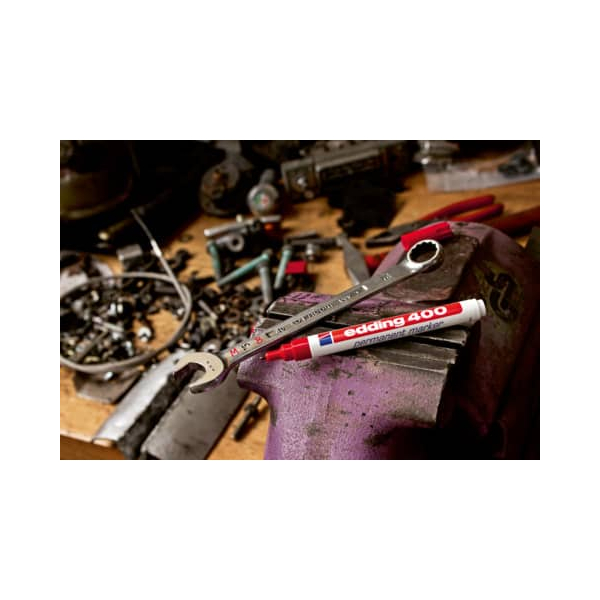 Entdecken Sie den Permanentmarker 400 von Edding – Ihr zuverlässiger Begleiter zum Beschriften, Bemalen und Kennzeichnen nahezu aller Materialien, einschließlich Metall, Glas und Kunststoff.