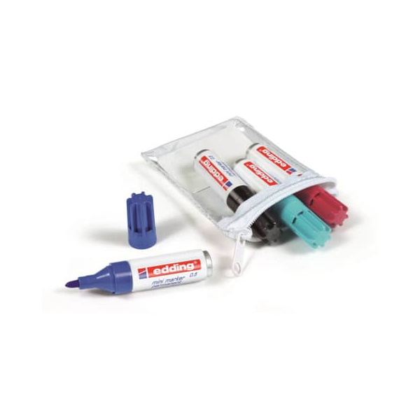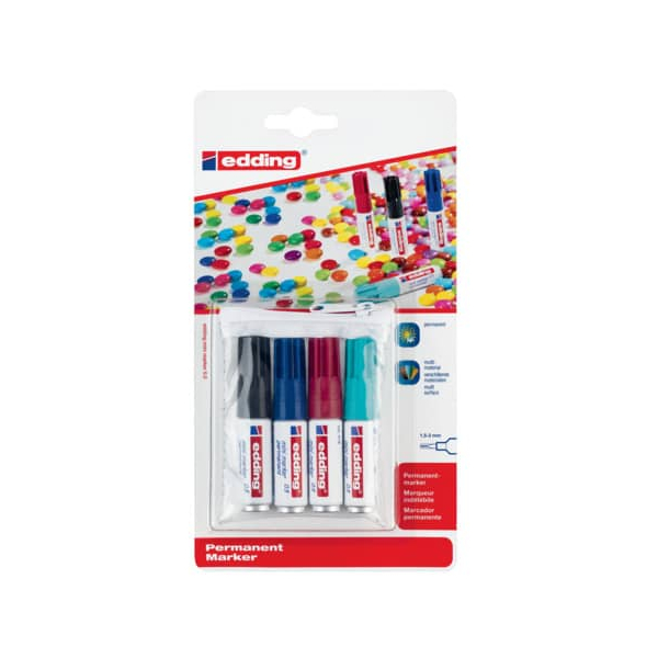 Edding mini permanentmarker 05-4-1 Permanentmarker-Set Einweg. • Schreibfarbe: 4-farbig sortiert / schwarzblau/schwarz/karminrot/türkis • wasserfest,geruchsarm,schnell trocknend • Strichstärke: 1,5-3mm • Spitzenform: Rundspitze
