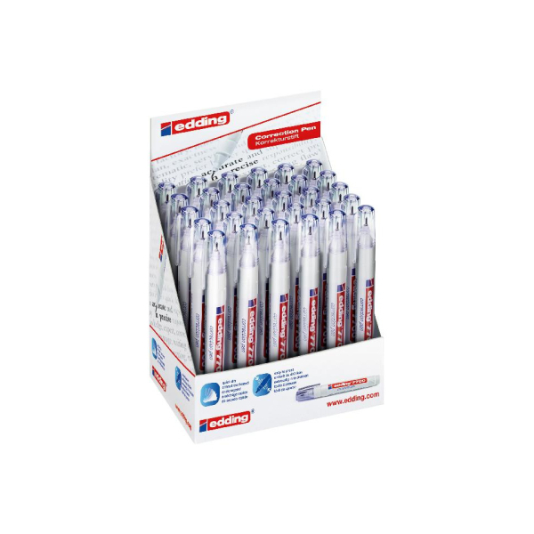 Korrekturstift zum Korrigieren von handgeschriebenen und gedruckten Texten. Die Metallspitze verfügt über eine Strichbreite von 1-2 mm. Weiche Druckzone für eine leichte Handhabung. Die Korrekturtinte des Stiftes ist deckend und schnelltrocknend. Korrekturroller zum seitlichen Korrigieren von handgeschriebenen und gedruckten Texten. Das Korrekturband hat eine Strichbreite von 4,2 mm und eine Strichlänge von 6 m. Die flexible Spitze ermöglicht die optimale Anwendung. Das Korrekturband hat eine hohe Deckkraft und erlaubt sofortiges Überschreiben. Die ergonomische Griffzone sorgt für ein komfortables und angenehmes Korrigieren von Texten. Das Display enthält 24 Stück edding 7410 correXion tape. Das transparente Gehäuse ermöglicht eine Kontrolle über die verbleibende Bandlänge.