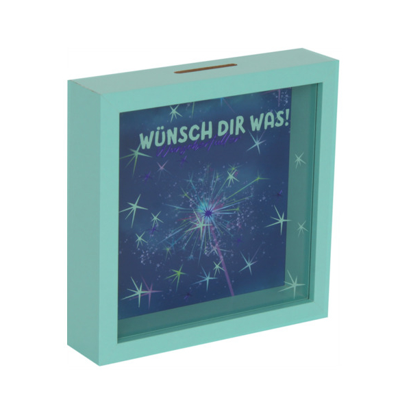 Die Spardose Kasten (mittel) 746108 von EigenArt ist der perfekte Begleiter für jeden, der seine Wünsche in die Realität umsetzen möchte. Diese türkise Spardose mit Glasfront misst 16 x 16 x 10 cm und besticht durch ihren motivierenden Schriftzug „Wünsch dir was! Wunscherfüller“. Sie ist ideal, um jeden Wunsch Schritt für Schritt zu sparen und zu erfüllen.