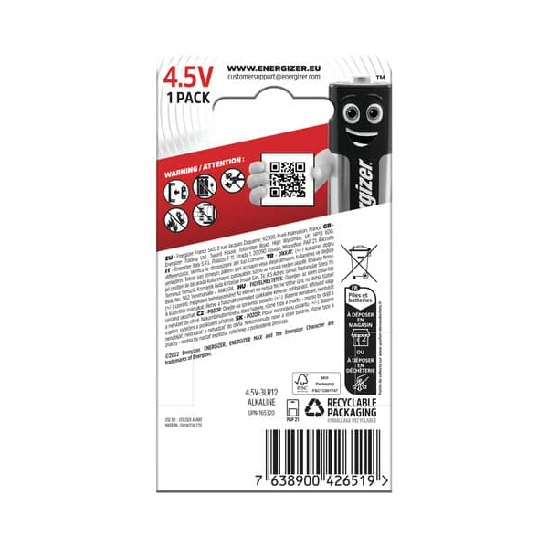 Energizer Max E301530300 Batterie. • Batterietyp: 3R12 (Flachbatterie / 3LR12) • Spannung: 4,5 Volt • Kapazität: 6100mAh • Batteriechemie: Alkali-Mangan