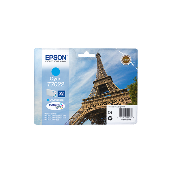 Epson Druckerpatrone T7022 (C13T70224010) cyan ist kompatibel mit Epson Stylus WorkForce Pro WP-4015 DN, Epson Stylus WorkForce Pro WP-4025 DW, Epson Stylus WorkForce Pro WP-4515 DN, Epson Stylus WorkForce Pro WP-4525 DNF, Epson Stylus WorkForce Pro WP-4535 DWF, und Epson Stylus WorkForce Pro WP-4545 DTWF. Die Reichweite beträgt ca. 2.000 Seiten bei 5% Deckung.