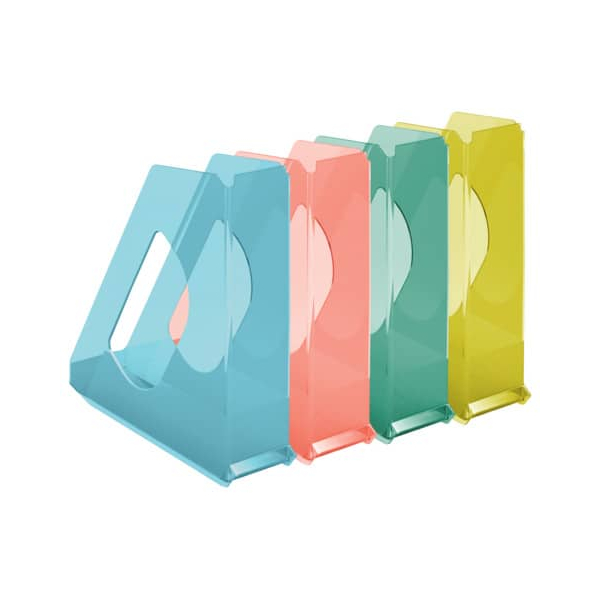 Gefertigt aus robustem Kunststoff, bietet der Stehsammler eine Füllhöhe von bis zu 70 mm. Die transluzente Oberfläche erlaubt einen schnellen Überblick über den Inhalt, während die verschiedenen Farben in einem farbigen Sortiment (2 x transparent koralle, 3 x transparent lavendel, 3 x transparent blau, 2 x transparent grün) frischen Wind in Ihr Büro bringen.