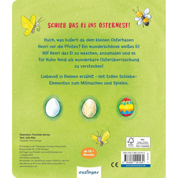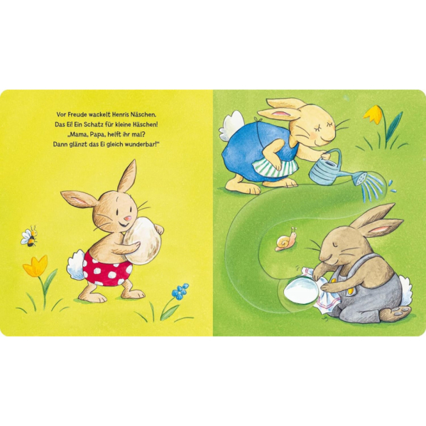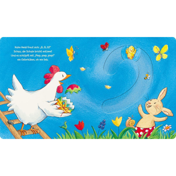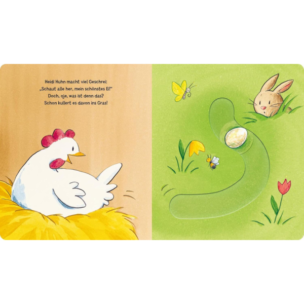 Huch, was kullert da dem kleinen Osterhasen Henri vor die Pforten? Ein wunderschönes weißes Ei! Gewaschen, poliert und kunterbunt bemalt, versteckt er es bei Huhn Heidi im Nest. Was für eine wunderbare Oster-Überraschung, als daraus ein zuckersüßes flauschiges Küken schlüpft! Dieses fröhliche Bilderbuch rund um den Osterhasen lädt schon die Allerkleinsten zum Mitmachen und Entdecken ein. Die liebevollen Spielelemente fördern Kreativität, Motorik und die Freude am gemeinsamen Lesen. Ein zauberhaftes Geschenk fürs Osternest und ein wunderschöner Einstieg in die Welt der Osterbräuche!