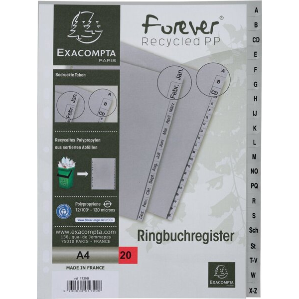 Exacompta Kunststoffregister Forever 1720B, A bis Z, A4, graue Taben, 20-teilig