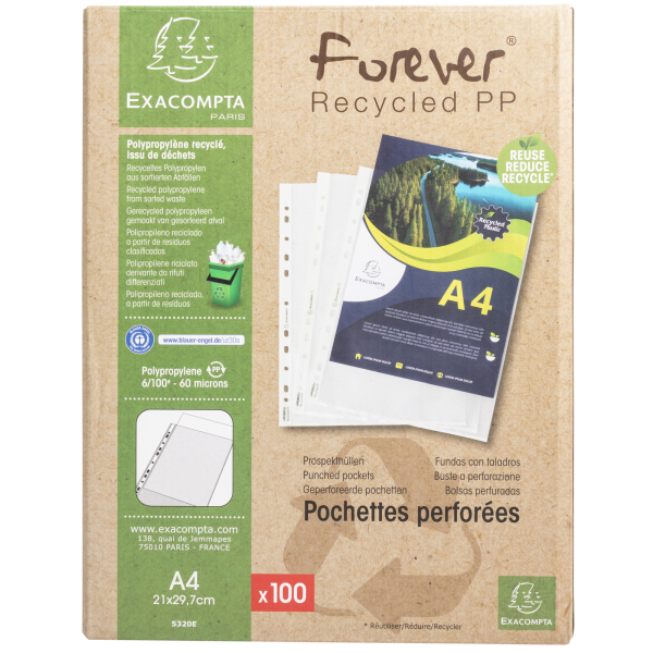 Entdecken Sie die hochwertigen Prospekthüllen Forever 5320E von Exacompta, die nicht nur funktional, sondern auch umweltfreundlich sind. Diese hocheffektiven Hüllen aus recyceltem Polypropylen (PP) bieten perfekten Schutz für Ihre Dokumente im Format A4 und sind dokumentenecht.