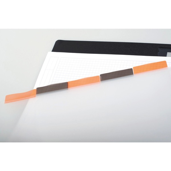 Mit der Schreibmappe haben Sie die Möglichkeit, Ihre Dokumente sicher zu transportieren, dank der elastischen Gummizüge, die einen sicheren Verschluss garantieren. Das flexible und entnehmbare Lineal sowie die fünf beschriftbaren Trennblätter bieten Ihnen die Möglichkeit, Ihre Unterlagen individuell zu strukturieren. Darüber hinaus sind zwei praktische Taschen integriert, um Visitenkarten und CDs sicher aufzubewahren.
