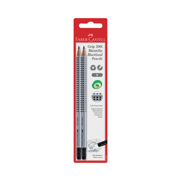Faber-Castell Bleistift-Set GRIP 2001, 117291, Härte B, silbergrau, mit Radiergummi