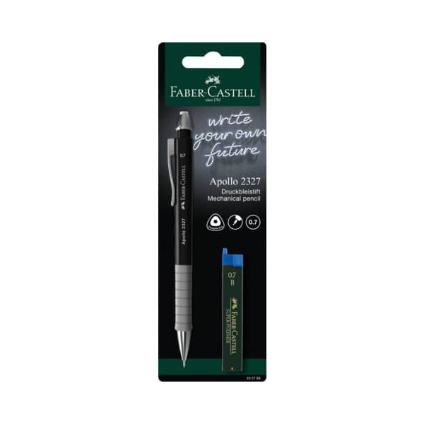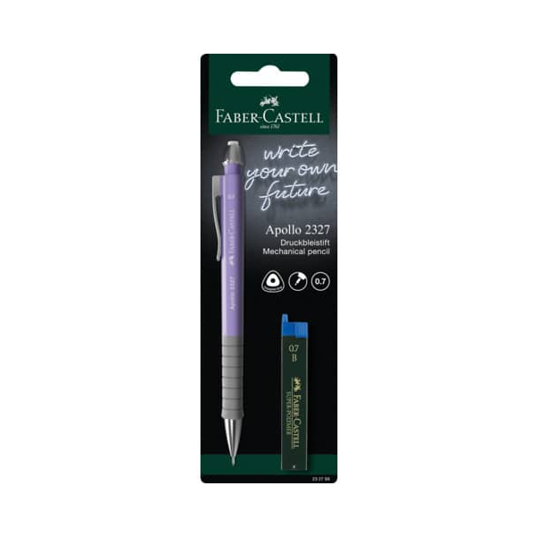 Faber-Castell Druckbleistift-Set Apollo im Blister, 232799, Härte B, 0,7mm, sortiert: sky blue,dunkelblau,schwarz,rose, mit Radiergummi