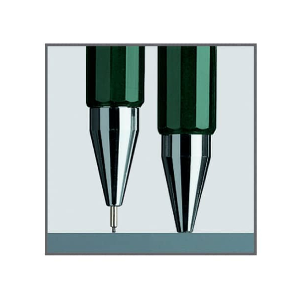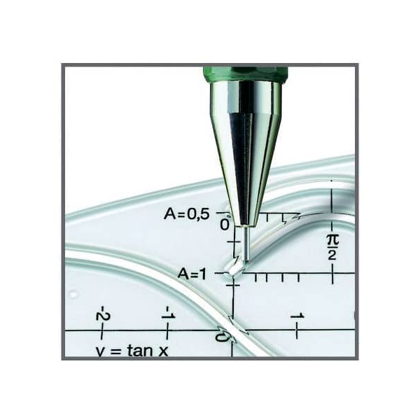 Das durchdachte Design umfasst auch einen Farbcode auf dem Druckknopf, der Ihnen sofort hilft, die Linienbreite zu identifizieren. Der grüne Schaft und das runde, geriffelte Griffstück bieten nicht nur eine ansprechende Optik, sondern auch hohen Komfort bei der Benutzung.