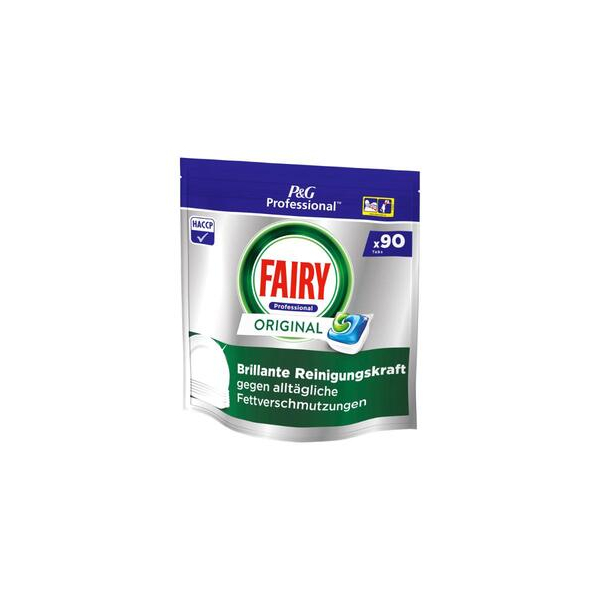Fairy Professional, besonders schnell lösliche Reinigungstabs, geeignet für herkömmliche und gewerbliche Spülmaschinen. Hervorragende Reinigungsergebnisse sogar mit allen üblichen Kurzspülprogrammen. Mini-Pouch mit 3-Kammer-System aus Pulver und Flüssigkeit. Packung mit 90 Tabs.