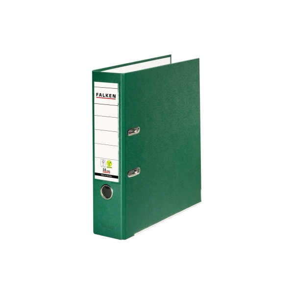Falken Color Vegan 09984055 Ordner • Format: A4 • Farbe: grün vollfarbig • Rückenbreite: 80mm breit für 600 Blatt • Material: Karton, PP-kaschiert • Zertifikat: FSC • Ringmechanik: Hebelmechanik • mit Einsteckrückenschild • mit Griffloch • mit Kantenschutz