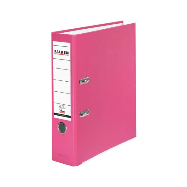 Falken Color Vegan 11286747 Ordner • Format: A4 • Farbe: pink vollfarbig • Rückenbreite: 80mm breit für 600 Blatt • Material: Karton, PP-kaschiert • Zertifikat: FSC • Ringmechanik: Hebelmechanik • mit Einsteckrückenschild • mit Griffloch • mit Kantenschutz