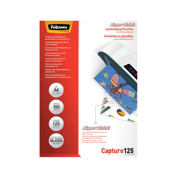 Kaufen Sie jetzt die Laminierfolien Capture125 SuperQuick von Fellowes und schützen Sie Ihre wichtigen Dokumente auf die schnellste und effektivste Weise!