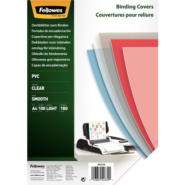 Fellowes Umschlagfolien / Bindefolien 5375901 • Format: A4 • Material: PVC • Folienstärke: 0,18 mm / 180 my • Farbe: transparent • Oberfläche: glänzend