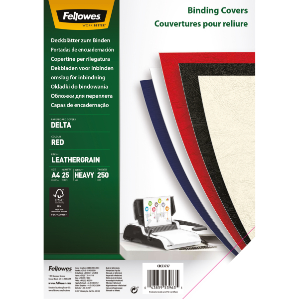 Entdecken Sie den Umschlagkarton Delta 5373702 von Fellowes, der nicht nur durch seine ansprechende rote Farbe besticht, sondern auch mit einer edlen Lederstruktur versehen ist. Dieser hochwertige Karton mit einer Papiergrammatur von 250 g/m² verleiht Ihren gebundenen Dokumenten ein professionelles Finish und sorgt dafür, dass sie im Gedächtnis bleiben.