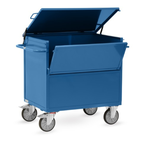 Der Wagen besteht aus geschweißtem Stahlrohr und Profilstahl, was ihm eine außergewöhnliche Stabilität verleiht. Die Winkelstahl-Konstruktion und die Wände aus gesicktem Stahlblech sind eingeschweißt, um eine langlebige Nutzung sicherzustellen. Dank des einteiligen Deckels, der durch Gasdruckfedern hochgestellt werden kann, ist der Zugang zum Innenraum besonders komfortabel. Zudem sind Ringösen für Vorhängeschlösser integriert, die zusätzliche Sicherheit bieten. Die Naben sind mit Rillenkugellagern ausgestattet, was für eine reibungslose Bewegung sorgt.