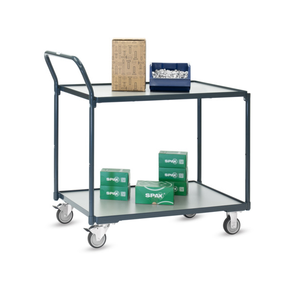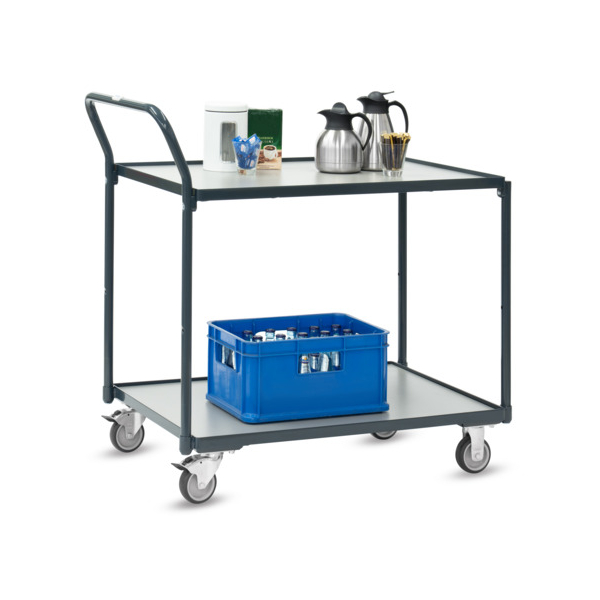 Der Tischwagen besteht aus hochwertigem Stahlrohr und Profilstahl, die sorgfältig geschweißt und pulverbeschichtet sind. Die anthrazitgraue Farbe (RAL 7016) verleiht ihm ein modernes Aussehen. Mit zwei stabilen Böden aus Holzwerkstoffplatte, die in einem robusten Stahlrahmen liegen und über einen 12 mm hohen Rand verfügen, ist dieser Wagen sowohl funktional als auch ästhetisch ansprechend. Der hochstehende Schiebegriff sorgt für eine einfache Handhabung.