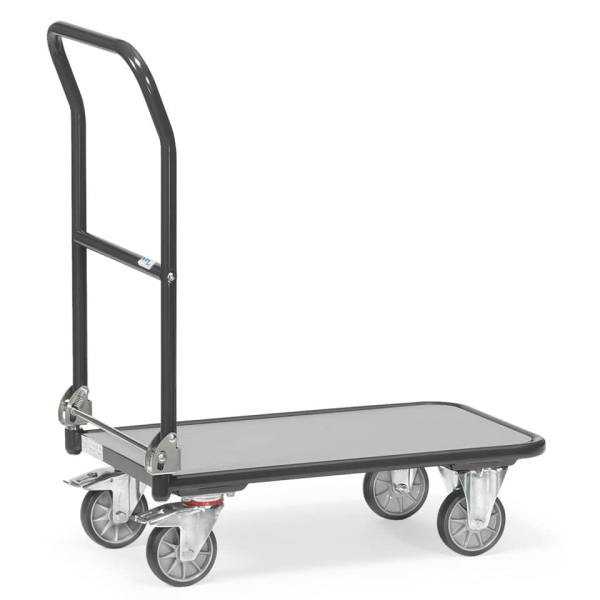 Die Ladefläche besteht aus einer stabilen Holzwerkstoffplatte mit einer mittelgrauen Oberfläche, die eine robuste und belastbare Fläche für Ihre Transporte bietet. Der klappbare Schiebebügel ermöglicht eine komfortable Handhabung und der Transportwagen lässt sich bei Nichtgebrauch platzsparend verstauen.