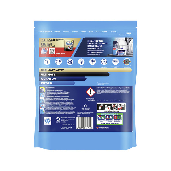 Für bessere Trocknung und strahlenden Glanz wird die zusätzliche Verwendung des Finish Glanz- und Klarspülers empfohlen. Für eine hygienisch saubere Spülmaschine wird die zusätzliche Verwendung des Finish Maschinentiefenreinigers empfohlen.