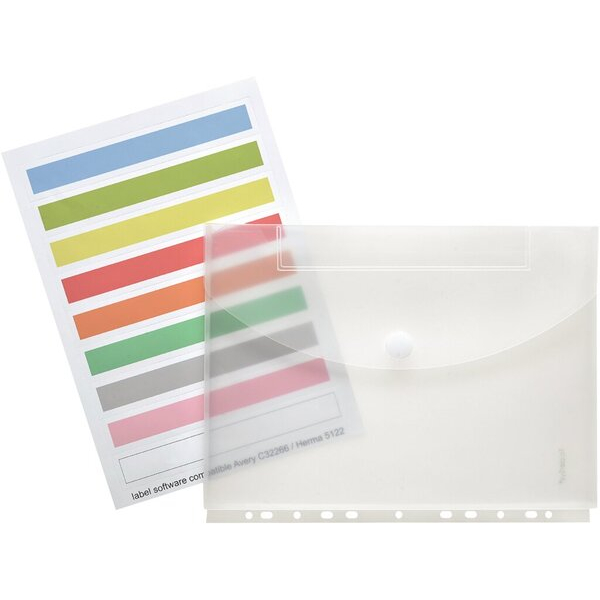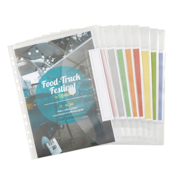 Im Lieferumfang sind zwei perforierte DIN A4 Schilderbögen enthalten, die sowohl in farbig als auch in weiß erhältlich sind. Die Index Dokumententasche ist zudem kompatibel mit gängiger Label-Software wie Avery C32266 und Herma 5122, sodass Sie Ihre Beschriftungen individuell gestalten können.