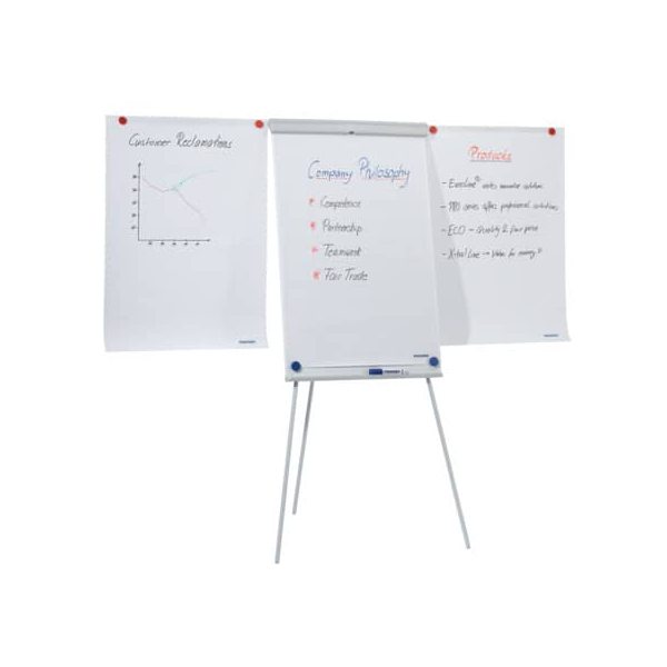 Stufenlos höhenverstellbar bis zu 180 cm Höhe. Funktionelles Blockhalter-System aus Kunststoff. Zwei Papierhalter. Magnethaftende, beschriftbare und trocken abwischbare Oberfläche inkl. Ablageleiste. Tafelformat: 105 x 68 cm.