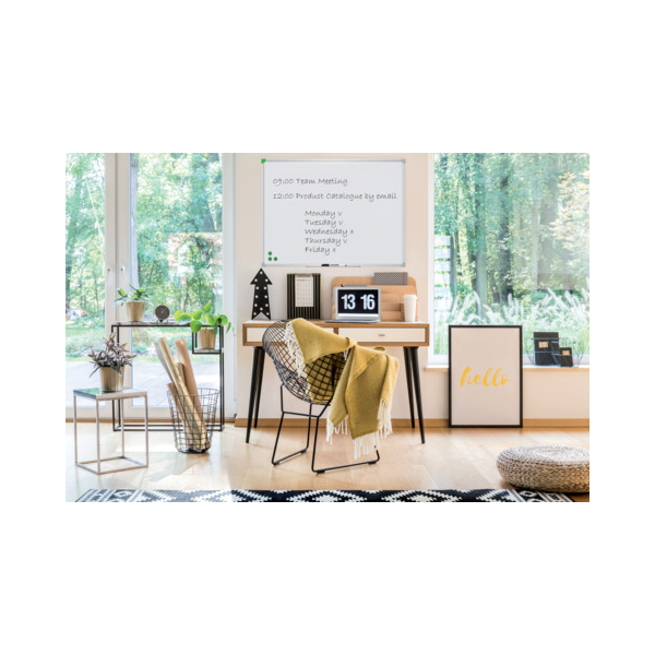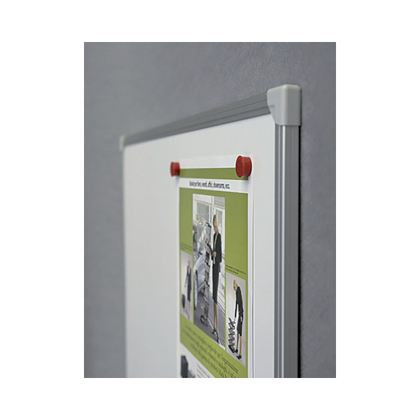Das Produkt ist mit einem silbereloxierten Aluminiumrahmen ausgestattet, wobei die Ecken in hellgrau (eine in grün) gehalten sind. Eine praktische Ablageschale für Ihr Zubehör ist ebenfalls im Lieferumfang enthalten. Die Montage ist unkompliziert und kann wahlweise im Hoch- oder Querformat erfolgen. Zudem ist das Whiteboard mit dem EU-Ecolabel zertifiziert, welches für eine geringere Umweltbelastung während des gesamten Produktlebenszyklus bürgt.