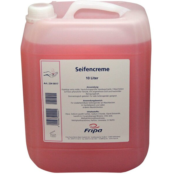 Entdecken Sie die hochwertige Fripa Seifencreme, die in einem praktischen 10 Liter Kanister geliefert wird und perfekt für die FRIPA Seifenspender geeignet ist. Diese hautschonende Seife bietet nicht nur einen hervorragenden Reinigungseffekt, sondern schützt Ihre Haut auch dank ihres speziellen Schutzfaktors. Die Reinigung ist aktiv und die Formel ist stark rückfettend, sodass Ihre Hände nach der Anwendung nicht austrocknen.