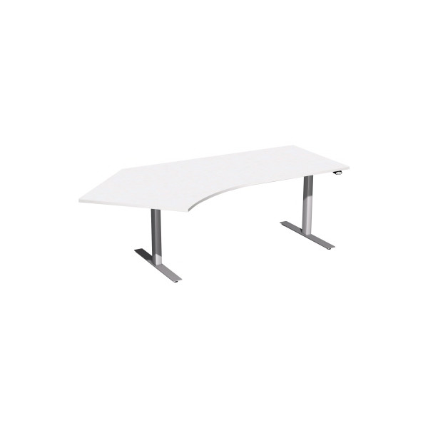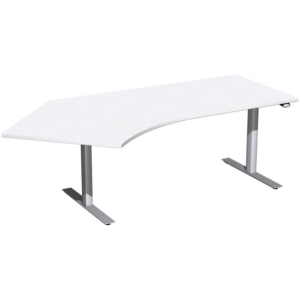 elektrisch höhenverstellbarer Sitz-Steh-Schreibtisch Geramöbel Elektro Flex S-08F1615-WS • für ergonomisches Arbeiten • Höhe: 65-125cm • Platte: weiß, 216,6x113cm (BxT), Freiform, links montierbar, Dreischicht-Feinspanplatte mit Melaminharzbeschichtung, 25mm • Gestell: silber, T-Fuß-Gestell, Stahl, pulverbeschichtet • ohne Rollen • Tragfähigkeit: bis 100kg • Anlieferung: zerlegt
