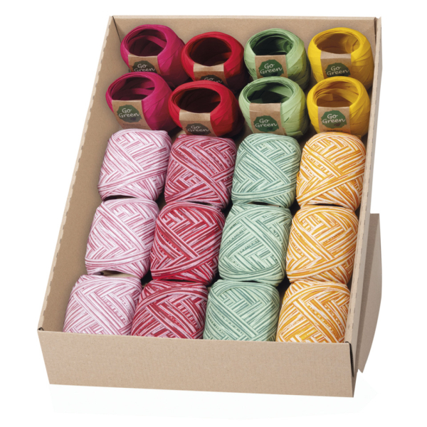 Eiknäuel Go Green Ganzjahr, 10 mm x 12 m. Nachhaltiges Geschenkband in 8 frischen Farben, ideal für vielseitige Dekorations- und Verpackungsanlässe das ganze Jahr über. Umweltfreundlich produziert und praktisch im Display sortiert präsentiert.