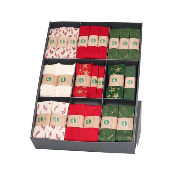 Der Weihnachts-Zierbandpräsenter enthält 60 Teile in verschiedenen, sortierten Strängchen und wird im praktischen Display geliefert. Ideal zum Dekorieren und Verschönern von Weihnachtsgeschenken oder -dekorationen.