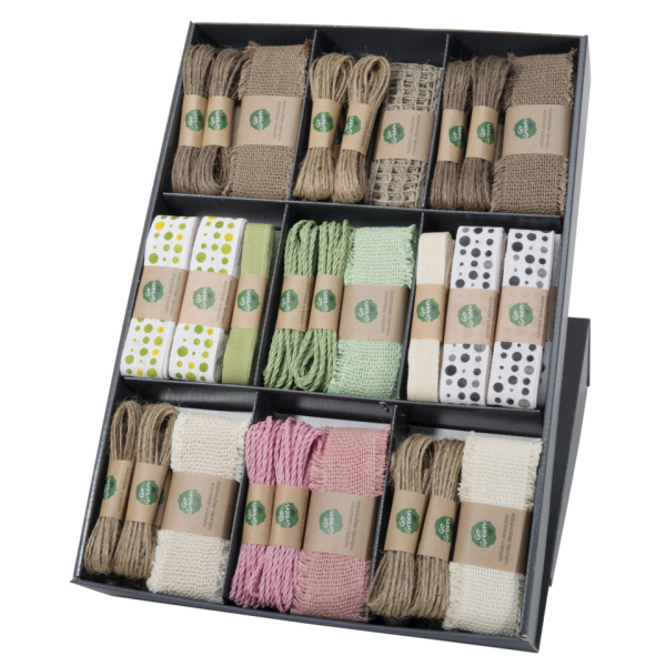 Zierbandpräsenter Strängchen, 66-teilig. Bunte Auswahl an kleinen Dekosträngchen in verschiedenen Farben und Mustern. Praktisch sortiert und ansprechend im Display präsentiert – ideal für kreative Bastel- und Dekorationsprojekte.