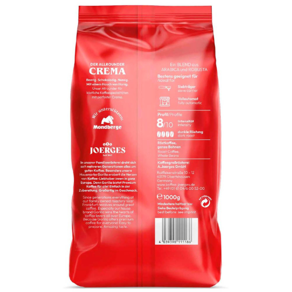 GORILLA Kaffee Espresso Super Bar Crema 296533, 1kg, ganze Bohnen im Beutel
