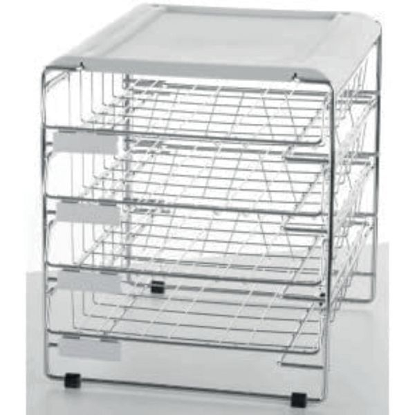 Gestell mit Gitterbriefkörben und einer grauen Abdeckplatte, 4 Körbe einzeln ausziehbar