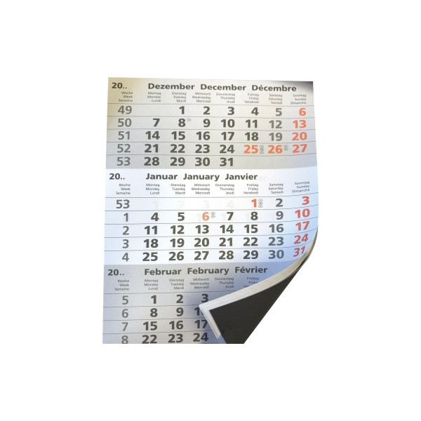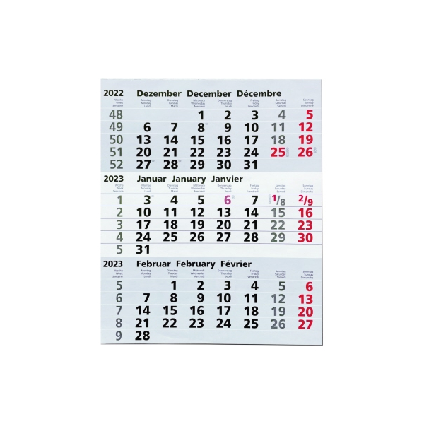 Der Druck erfolgt in zwei Farben, und das Kalendarium ist dreisprachig (Deutsch, Englisch, Französisch) gestaltet. Sonn- und Feiertage sind in einem auffälligen Rot markiert. Pro Blatt sind jeweils drei Monate übersichtlich dargestellt, wobei der aktuelle Monat mittig hervorgehoben und in Weiß gehalten ist. So behalten Sie stets den Überblick über Ihre wichtigsten Termine.